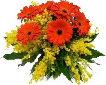 Montón de gerberas en colores cálidos y mimosas, adecuado para el Día de la Mujer.