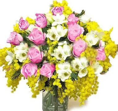 Elegante ramo de rosas rosadas, fresias u otras flores ligeras y mimosas, adecuadas para el Día de la Mujer.