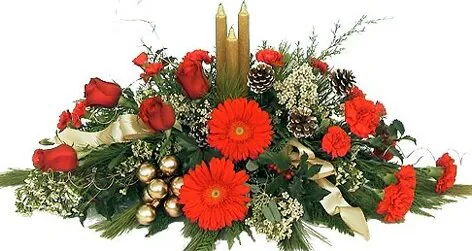 Desea a alguien una feliz Navidad con una pieza central de rosas, gerberas y flores mixtas de temporada en colores cálidos, vegetación decorativa y velas. Adecuado para las fiestas navideñas.
