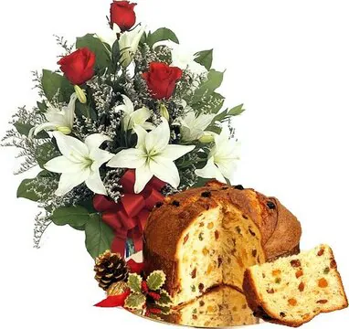 Desea a alguien una feliz Navidad con un ramo de 3 rosas rojas y lirios de colores claros decorados con vegetación de temporada, combinados con un panetone. Adecuado para las fiestas navideñas.