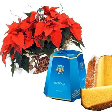 Desea a alguien una feliz Navidad con un arreglo de plantas de flor de Pascua de primera clase en una canasta decorada con vegetación de temporada, combinada con un pandoro. Adecuado para las fiestas navideñas.