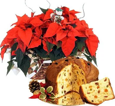 Desea a alguien una feliz Navidad con un arreglo de plantas de flor de Pascua de primera clase en una canasta decorada con vegetación de temporada, combinada con un panetone. Adecuado para las fiestas navideñas.