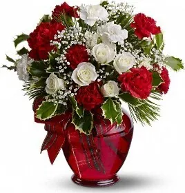 Desea a alguien una feliz Navidad con un ramo de rosas blancas y rojas y flores de temporada mixtas, decoradas con vegetación. Adecuado para las fiestas navideñas.