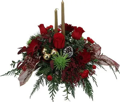 Desea a alguien una feliz Navidad con una pieza central de rosas, gerberas y flores mixtas de temporada en colores cálidos, decorados con vegetación. Adecuado para las fiestas navideñas.