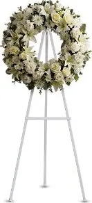 Lujosa corona funeraria de delicadas rosas, lirios y flores mixtas de temporada en colores claros y vegetación decorativa. Adecuado para ocasiones como la simpatía y los funerales para llorar y expresar sus más profundas condolencias a sus seres queridos.